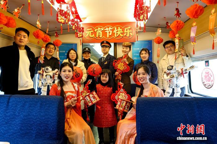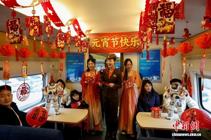 图为列车员取搭客正在车箱里悲度元宵节。中新社记者 弛畅 摄
